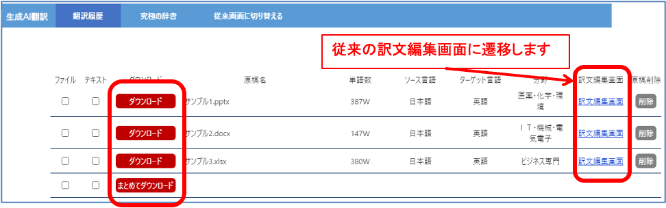 シンプル画面の[翻訳履歴]からも、翻訳結果のダウンロードと訳文編集画面への遷移が可能です。