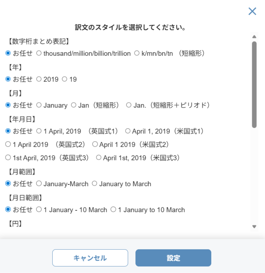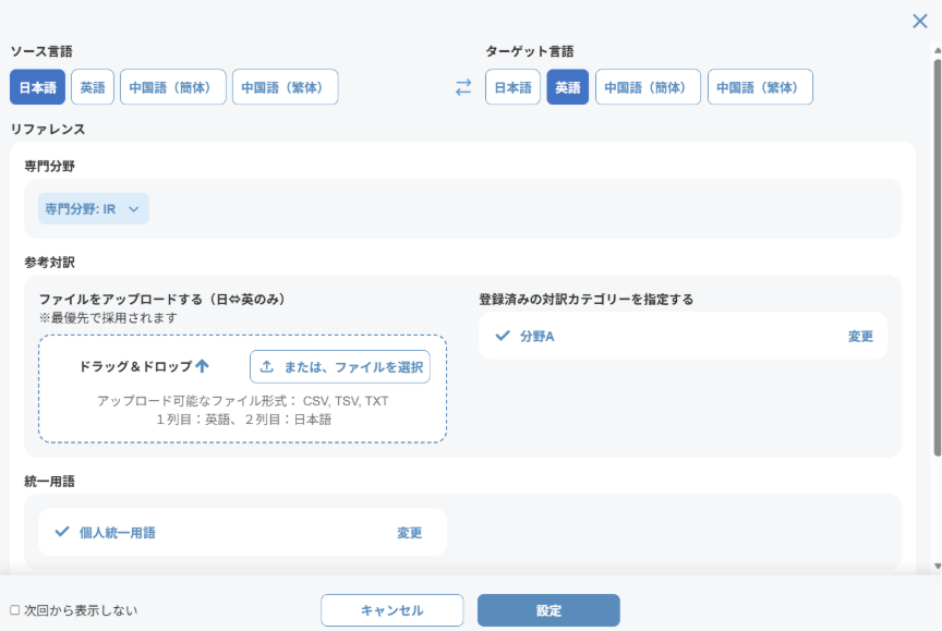 生成AIのファイル翻訳画面を開くと最初に表示されるモーダルで、以下を一括指定できます。
