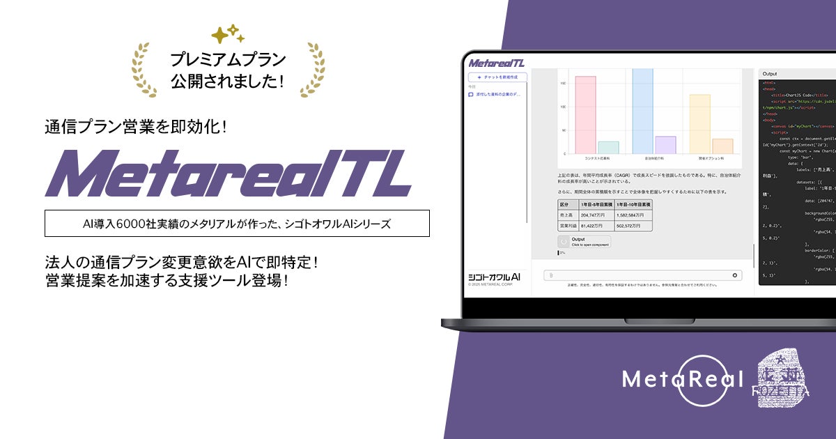 メタリアル・グループの株式会社ロゼッタ(代表取締役:五石 順一)は、法人の通信プラン見直しニーズ予測AIエージェント「Metareal テレコムインサイト」(以下、Metareal TL)のプレミアムプラン(⽉額5万円(税込)、1⽇20回・⽉200回利⽤可能)を2025年11⽉21⽇(金)より提供開始しました。