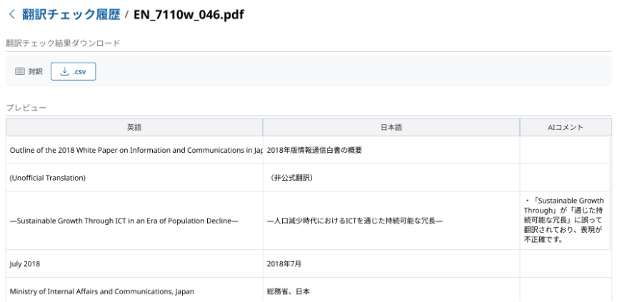 翻訳チェックは、アップロードしたファイルや過去の翻訳履歴を対象に、AIが訳抜けや数字の不整合などのエラーを自動検出し、改善案をコメントとして提示してくれる新機能です。