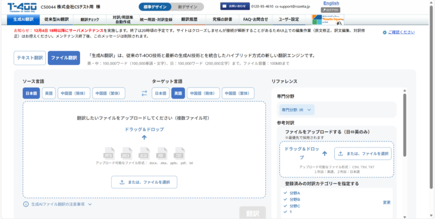 TOP お知らせ 【T-4OO】グローバルメニューのTOPが「生成AI翻訳」になりました